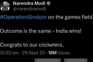जीत के बाद पूरे देश में खुशी की लहर दौड़ गई और सोशल मीडिया पर बधाइयों का सिलसिला शुरू हो गया। प्रधानमंत्री नरेंद्र मोदी ने भी टीम इंडिया को बधाई देते हुए एक खास संदेश साझा किया। उन्होंने लिखा, “#OperationSindoor on the games field. Outcome is the same — India wins!” यानी, “खेल के मैदान पर भी ऑपरेशन सिंदूर का नतीजा वही रहा — भारत की जीत।” पीएम की इस टिप्पणी ने मैच की जीत को हाल के सैन्य अभियान ‘ऑपरेशन सिंदूर’ से जोड़ दिया, जिससे यह बयान राजनीतिक और रणनीतिक चर्चाओं का भी केंद्र बन गया।